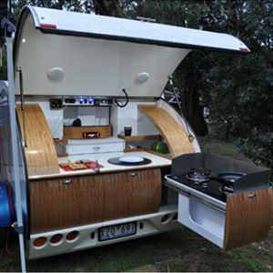 Getting access to the well-equipped kitchen is as easy as lifting the rear hatch, with gas struts making it a lightweight job. Fitted to the kitchen bench is a round stainless-steel sink, shelving and a centre section which contains your essential electricals (12V switches, charger points and mains power point) and a rotating entertainment console with a flatscreen TV on one side and a radio on the other! What more could you need?